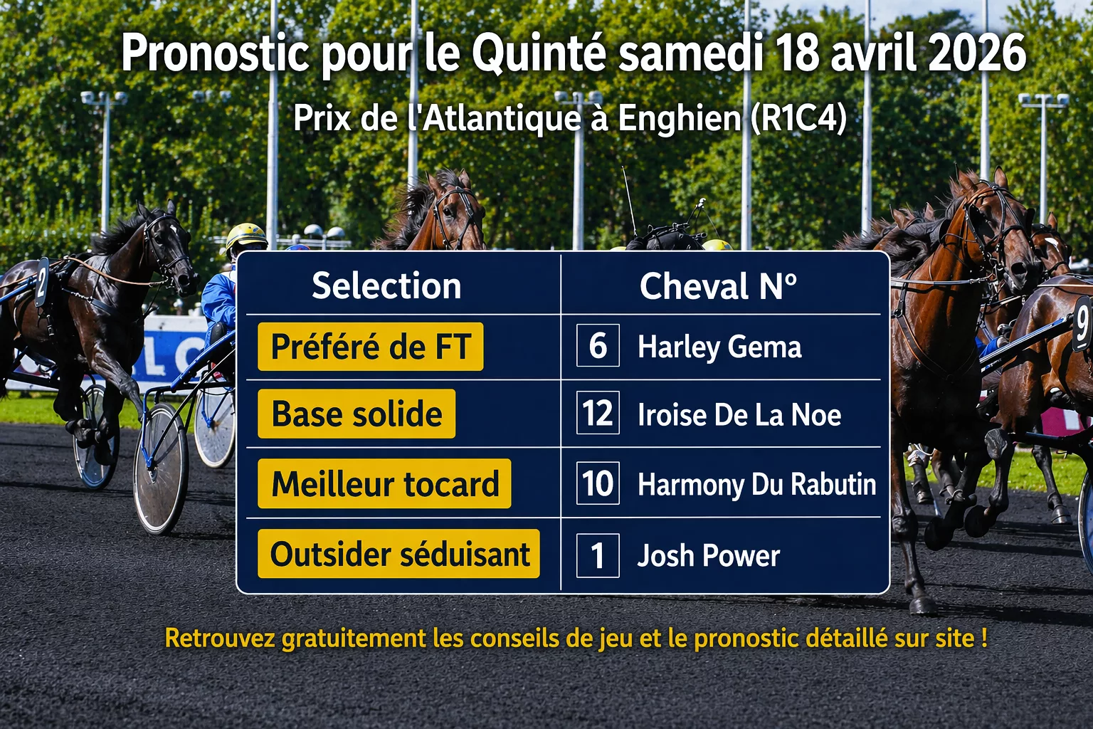 On se retrouve pour l’analyse et le pronostic de ce Tiercé Quarté Quinté+ du samedi 18 avril 2026 qui aura comme support le Prix de l’Atlantique, une épreuve de Groupe I disputée sur l’hippodrome d’Enghien (Réunion n°1 – Course n°4). Cette course internationale, disputée sur les 2.150 mètres autostart, a réuni 13 trotteurs d’élite âgés de 4 à 11 ans. Sur ce tracé de vitesse, la position derrière la voiture, la vitesse de base et la capacité à patienter sans consommer seront, comme souvent, déterminants.